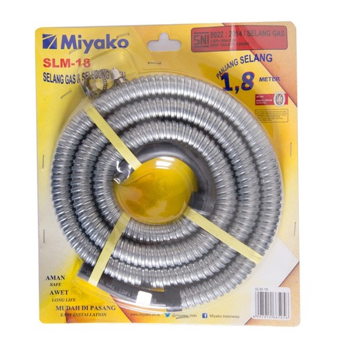 Selang Miyako SLM-18 merupakan selang regulator yang berfungsi sebagai katup untuk membuka atau menutup aliran gas yang dipasang di kepala tabung gas. Hal ini untuk memberikan pengamanan lebih dari sekedar pengontrol katup pada kompor. Selang regulator ini pelengkap komponen kompor gas agar dapat berfungsi dengan baik. Berperan penting dalam menunjang keamanan di setiap pemakaian kompor, selang haruslah yang aman. Miyako SLM18 – Selang Gas Spiral memiliki panjang 1.8 meter yang telah memenuhi standard dan lolos uji coba bakar hingga uji coba kebocoran. Selang regulator ini telah dilengkapi dengan regulator berukuran kecil dan terbuat dari material Zinc Alloy. Selang regulator ini mudah dipasang, dengan sistem clamping pada setiap sambungan menjadikan mudah dalam pemasangan dan telah dilapisi dengan spiral yang kuat dan tahan lama.